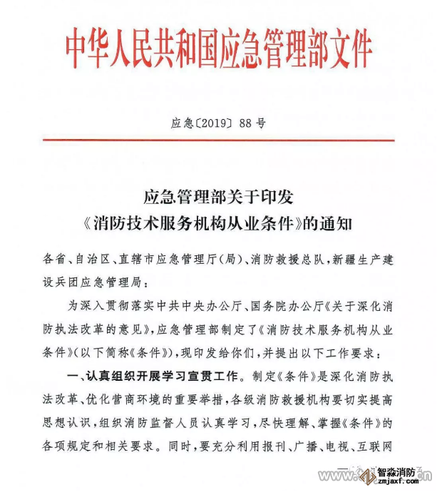 為深入貫徹落實中共中央辦公廳、國務院辦公廳《關于深化消防執法改革的意見》,應急管理部制定了《消防技術服務機構從業條件》(以下簡稱《條件》),現印發給你們,并提出以下工作要求: