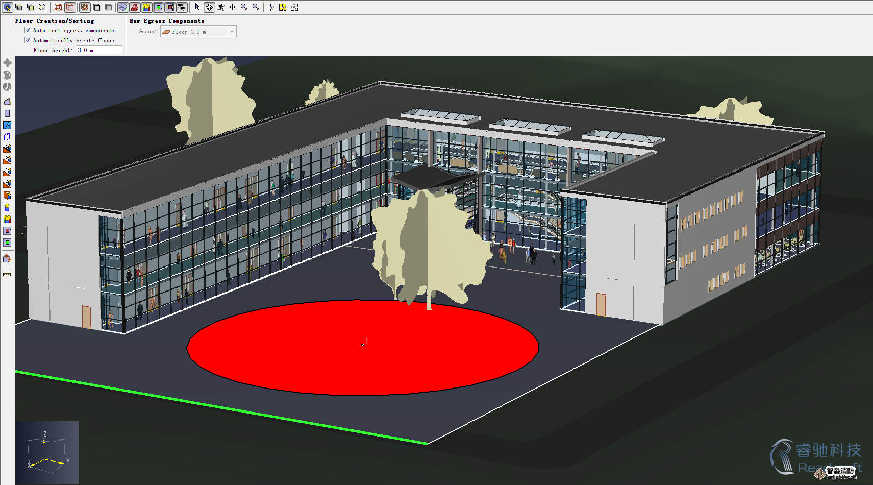 -Pathfinder還專門提供了高性能可視化的3D時(shí)間歷程模擬,利用透明化功能來更好地顯示密集人群在樓層中的疏散情況。