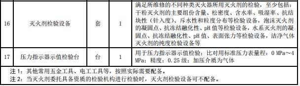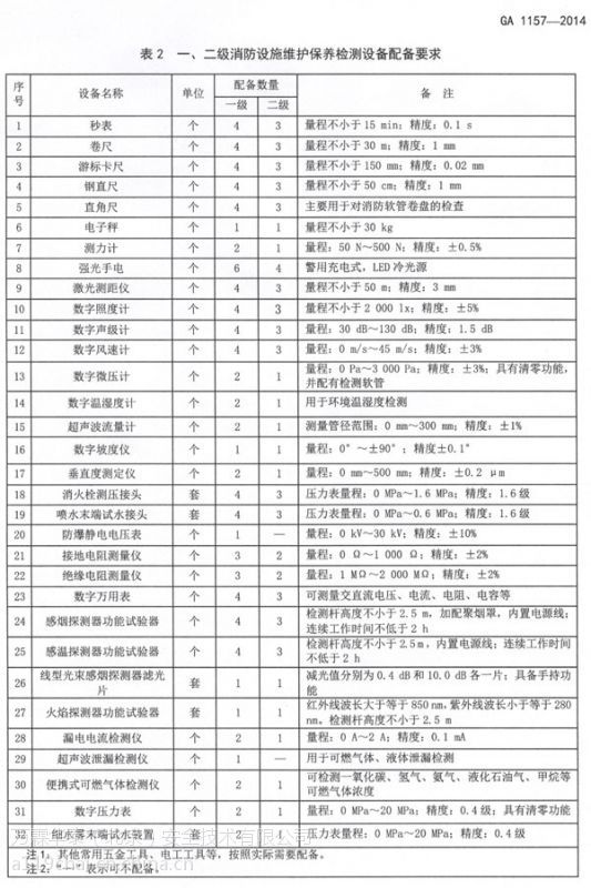 一二級消防設施維護保養檢測設備用于建筑消防設施的維護、保養和檢測,其設備配備的種類和數量至少應滿足表 2 的要求